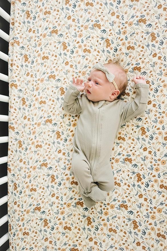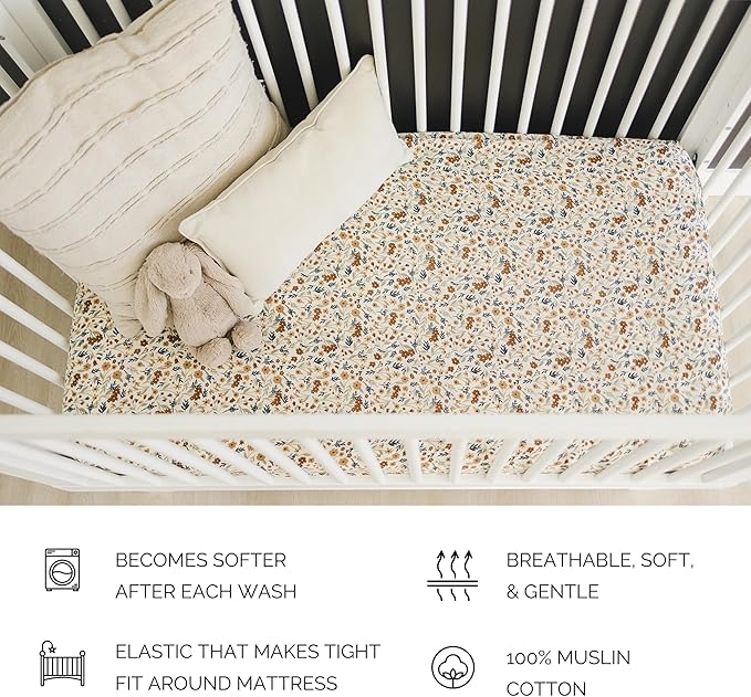 Harvest Floral Muslin Crib Sheet by Mebie Baby, Soft and Breathable Bed Sheets for Babies, Modern Neutral Bedding for Cribs, Standard Crib Mattress Fitted Sheet, Great for Boy or Girl Room or Nursery