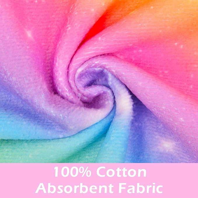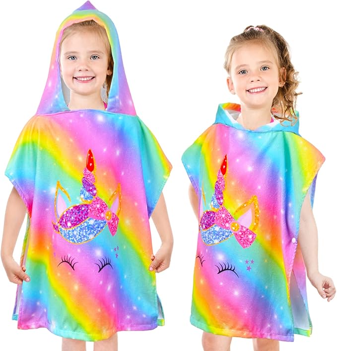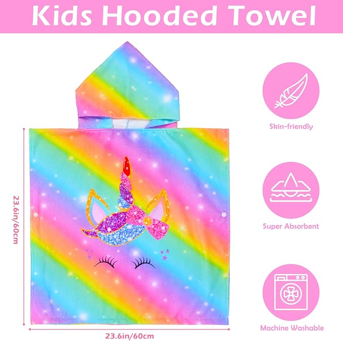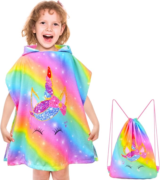Bath Beach Pool Towel with Hood for Kids Girls, Hooded Towels Swim Poncho Towel Cover-ups for 3-8 Years with Drawstring Bag, Super Absorbent, 24 in x24 in (Rainbow Unicorn)