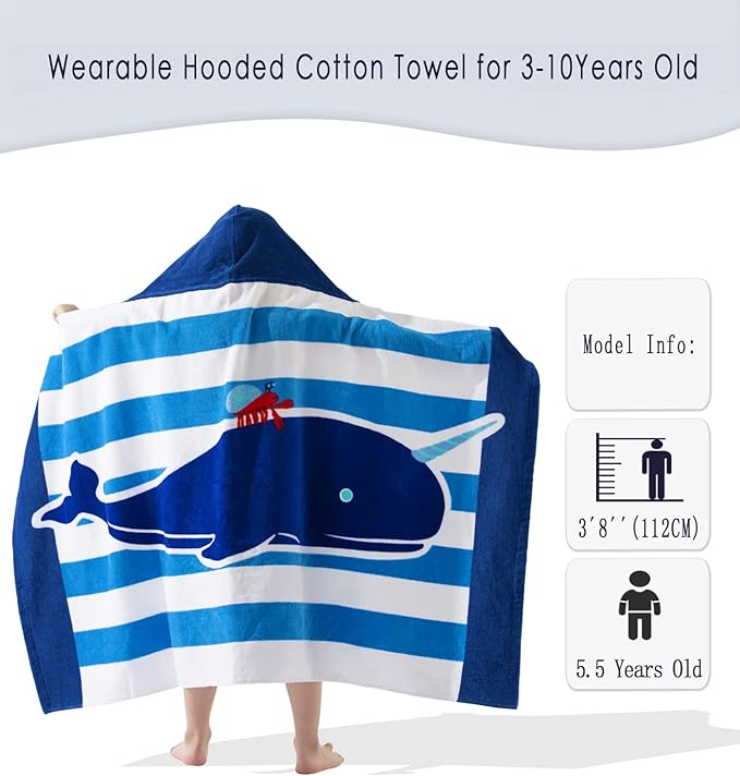 - 【🏖WHALE BEACH TOWELS】 This Hooded COTTON towel wraps adopts an environmentally friendly Printing, the cute NARWHALE make kids towel so gorgeous and be kids costume cape and attractive that can get children’s love at once! The bright BLUE color Whale unisex, absolutely lovely and make your littles stands out from bath beach or pool.