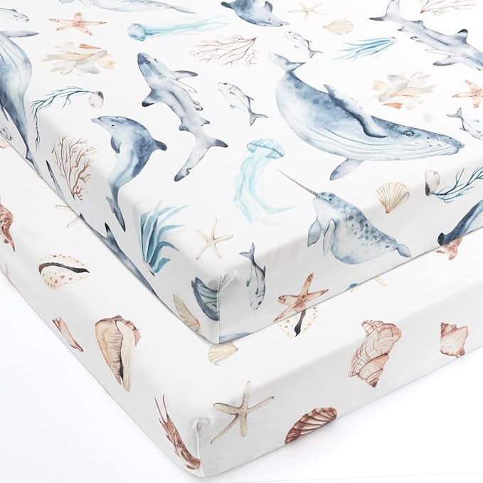 GRSSDER Stretchy Super Soft Jersey Knit Fitted Pack n Play Sheets Set 2 Pack,Portable/Mini Crib Sheets Snug and Safe,Beautiful Marine Organism for Boys and Girls
