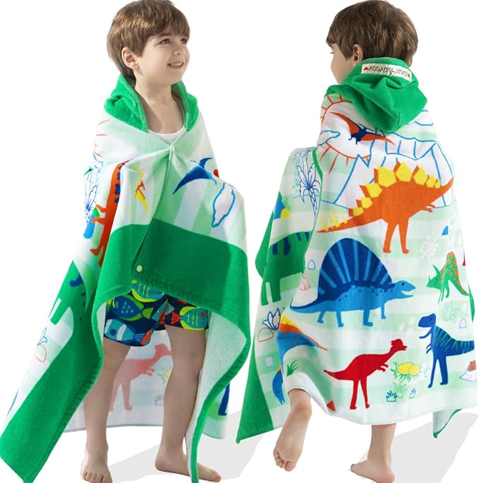 - JUNGLE DINOSAURS This Hooded COTTON : towel wraps adopts an environmentally friendly Printing, the various Dino make kids towel so gorgeous and be kids costume cape and attractive that can get children’s love at once! The bright green color Dinosaur unisex, loved both by boys and girls, absolutely lovely and make your littles stands out from bath beach or pool