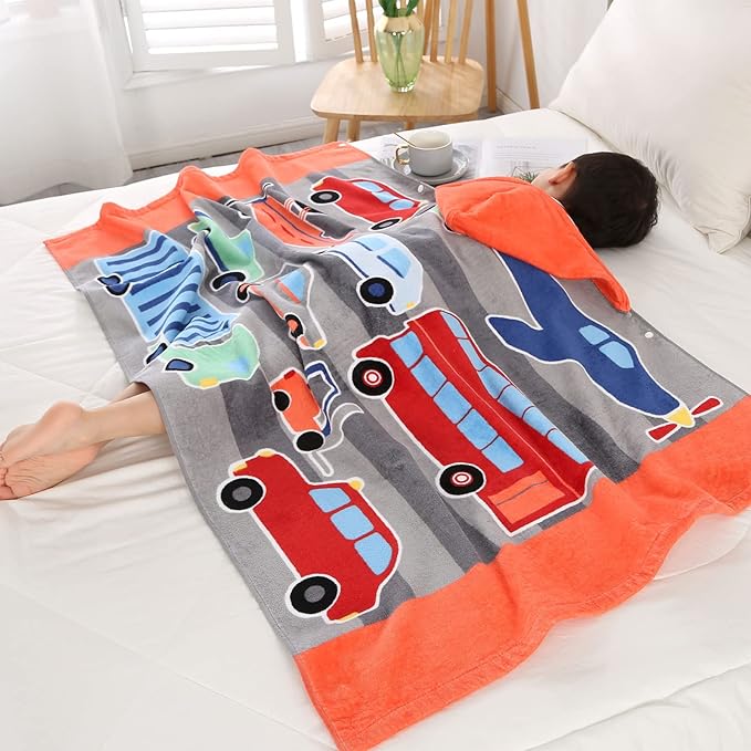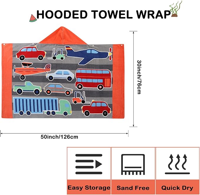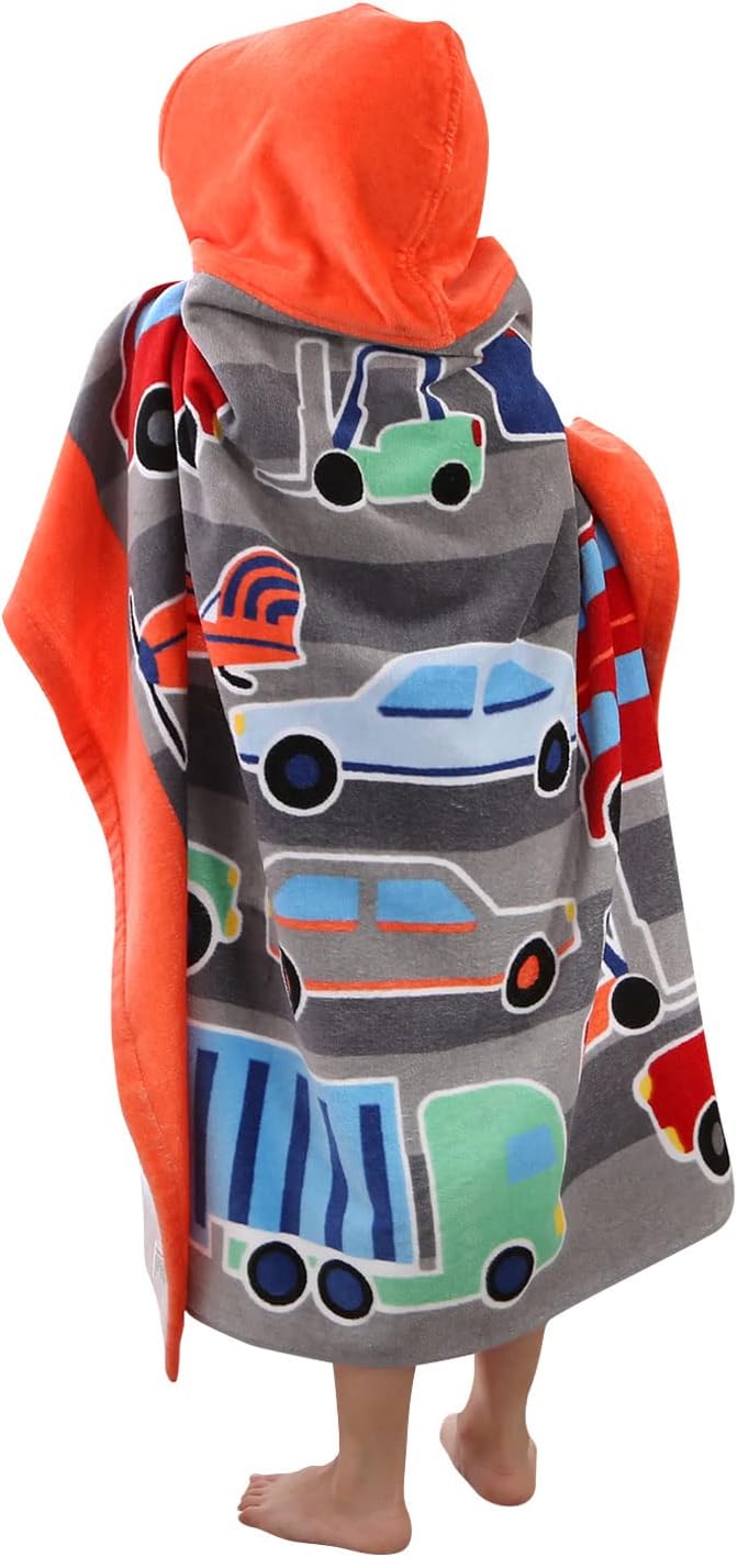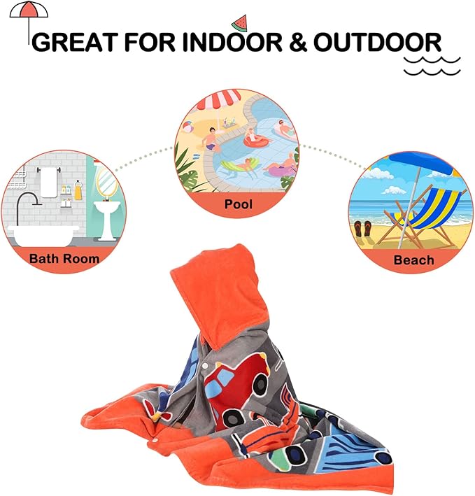 - 【Design & Theme】With buttons on front of the poncho towel wrap,, adjustable and more convenient for kids to put on and off. Hooded design on car beach towel to prevent children from catching cold. Fun themed designs and vibrant colors add even more fun for kids at the beach and in the bath.