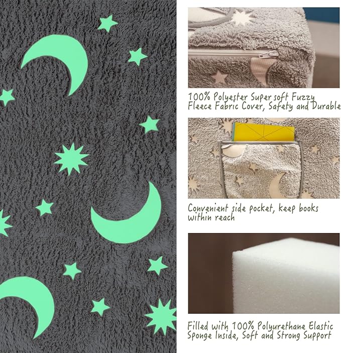 - Cute Design: The Glow in the Dark design on our Kids Couch creates an enchanting world for children. Whether snacking, watching TV, reading, or resting, it offers a cozy spot. With side pockets for books and toys, it's portable enough for kids to fold themselves, anywhere.