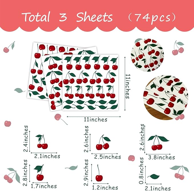 - Total 3 sheets, 11"X11"/sheet, cute fruit red cherry wall decal.