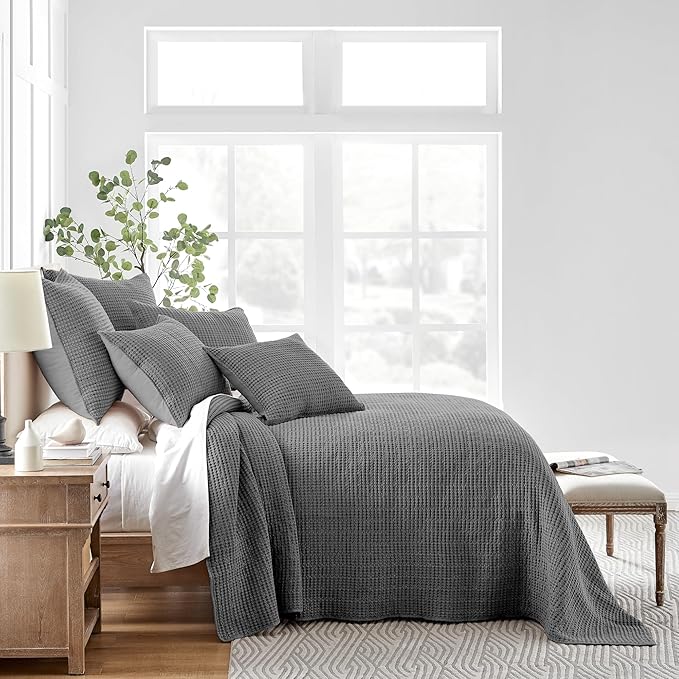 - Timeless Waffle Texture. This bedspread king size features a classic waffle weave on the front for a tactile, textural look, backed with a smooth coordinating cotton fabric. Designed to bring tactile dimension and understated elegance to your space—ideal for contemporary, coastal, or minimalist bedrooms.