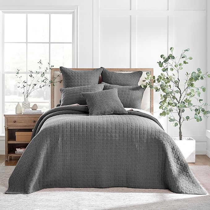 Levtex Home Mills Waffle King Bedspread Set (120x104in) with 2 Pillow Shams (36x20in) - Charcoal - Cotton King Size Bedspread Set - Soft, Pre-Washed