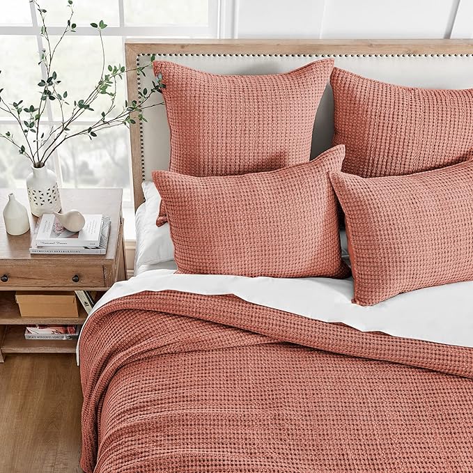 - Timeless Waffle Texture. This bedspread full size features a classic waffle weave on the front for a tactile, textural look, backed with a smooth coordinating cotton fabric. Designed to bring tactile dimension and understated elegance to your space—ideal for contemporary, coastal, or minimalist bedrooms.