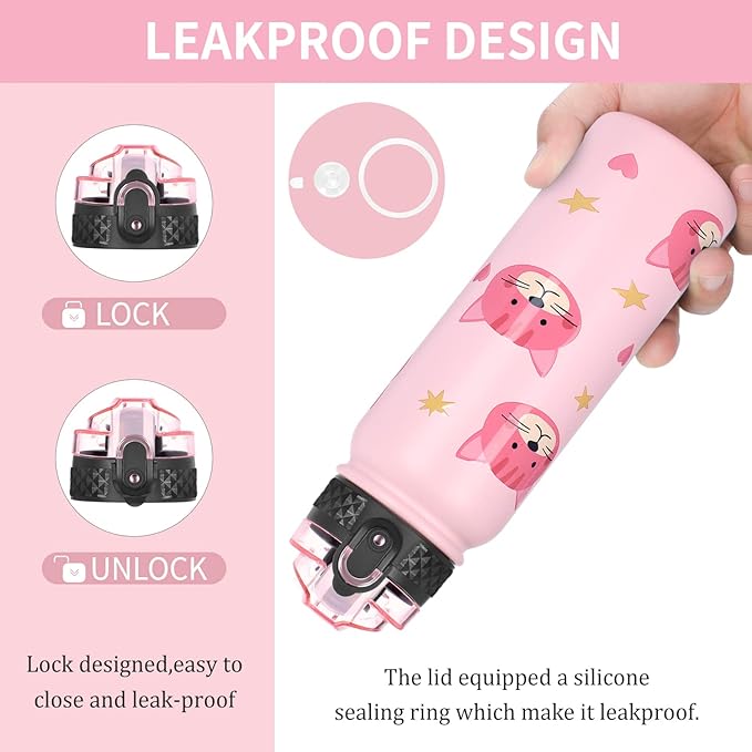 GOPPUS Kids Water Bottle with Straw Lid 20 oz Cat printing Double Walled Metal Insulated Stainless Steel Sports Water Bottles Leak Proof with Strap Handle for Boys Girls School(ink Cat 1 Lid)