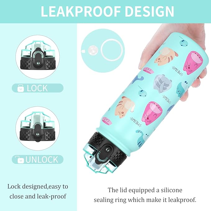 GOPPUS Kids Water Bottle with Straw Lid 20 oz Cat printing Double Walled Metal Insulated Stainless Steel Sports Water Bottles Leak Proof with Strap Handle for Boys Girls School(Green Cat 1 Lid)