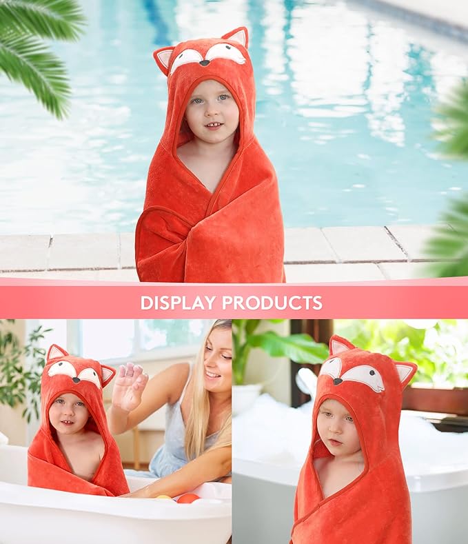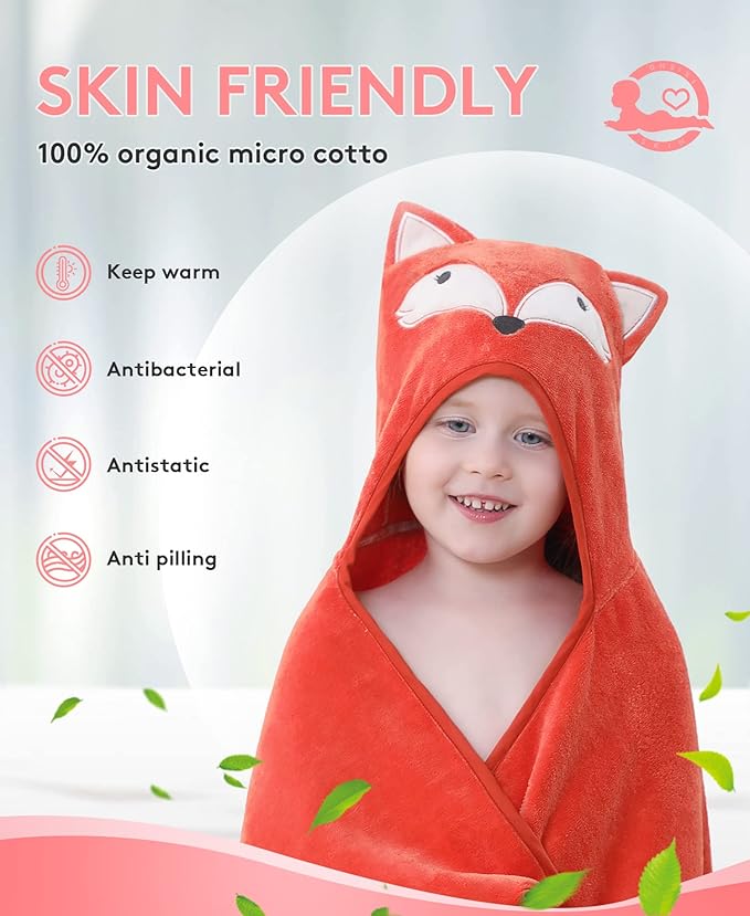 Hooded Towel for Kids 100% Cotton Ultra Soft with Unique Animal Design Large for Infants 3-10 Years (Fox)