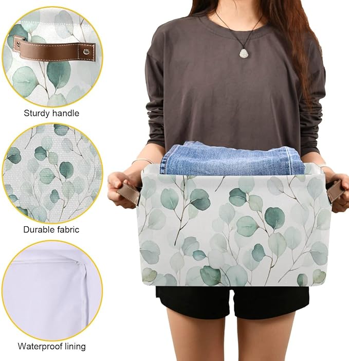 Wamika Leaves Flowers Storage Basket, Green and White Boho Botanical Foldable Storage Bins, 16x12x8 Inches, Durable Canvas Material, Easy to Clean, Collapsible for Space-Saving Storage