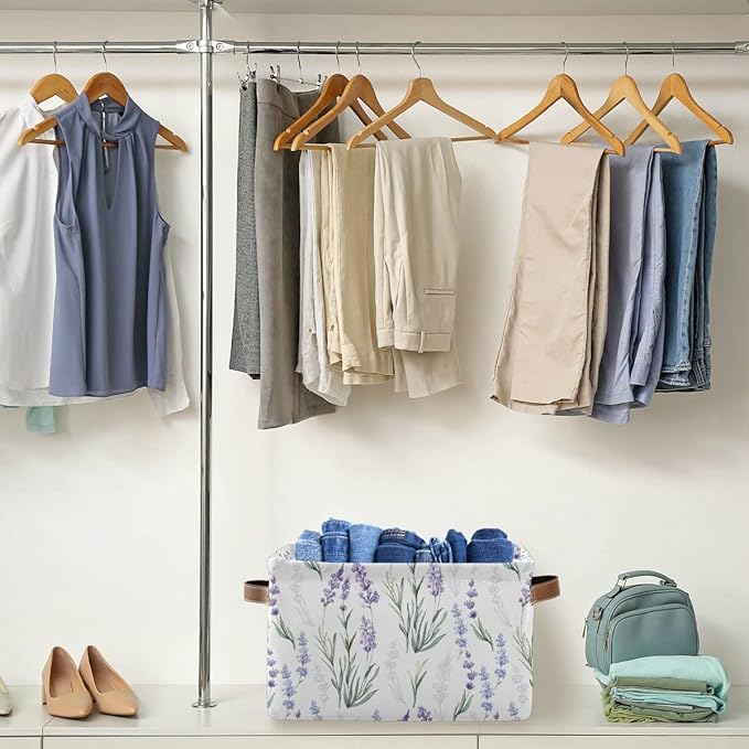 Lavender Flowers Storage Basket Fabric Storage Bin Laundry Baskets, Leaves Green Purple Foldable Storage Boxes Organizer Bag for Baby Cloth Dog Toy Book Storage Cubes Shelf Closet Basket 16×12×8