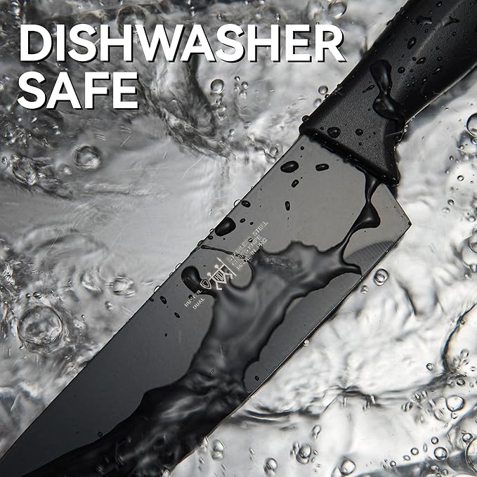 - CRAFTSMANSHIP - Non-Stick and Rust Resistant - With a black coating that prevents oxidation of the steel, the kitchen knife set will last a long time and remain non-stick and rust resistant. The ergonomically designed handle provides a comfortable grip and the handle will no longer loosen or fall off.