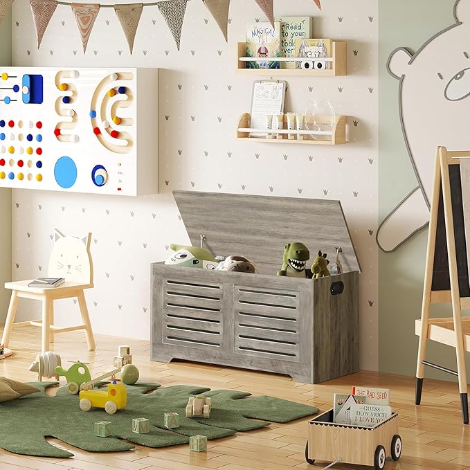 - 【Safe & Trustworthy】The sturdy toy box features a flip top lid with 2 safety hinges, holding the lid open and close slowly and smoothly without pinching child's little fingers. 2 cut-out handles allow you to easily move around. DINZI LVJ brings you an effortless life under the premise of ensuring your safe use