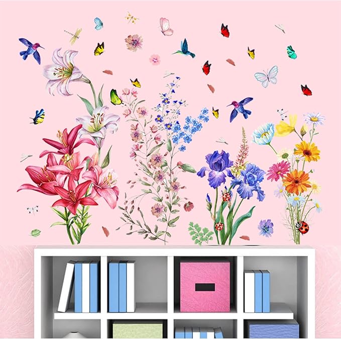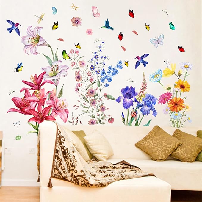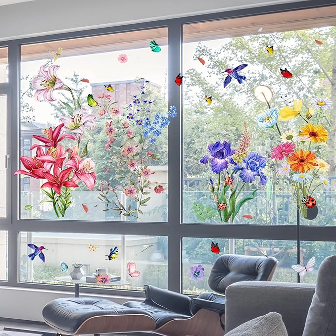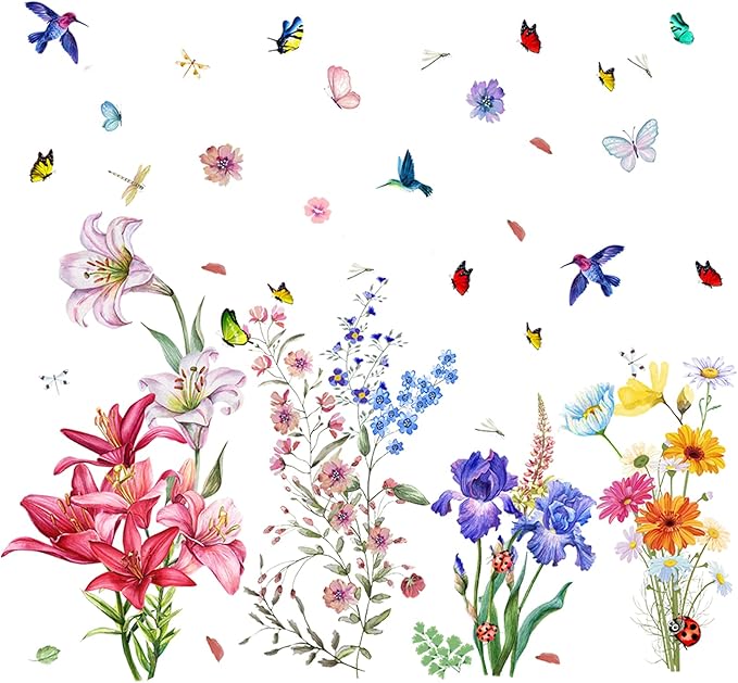 Garden Flower Wall Decals Lily Daisy Butterfly Dragonfly Bird Wall Stickers, Spring Window Clings for Glass Windows Living Room Bedroom Kitchen Wall Decor