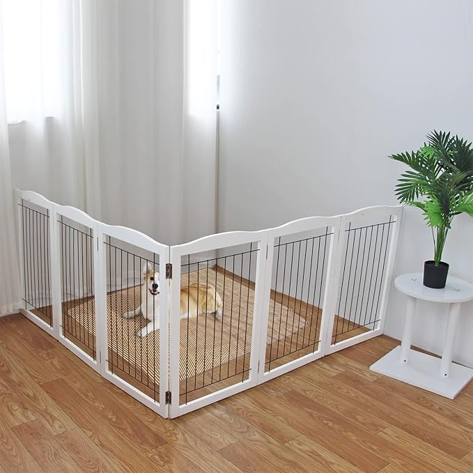 - 【Simple and Firm】 This convertible wooden dog gate is a pet fence, room divider, and pet pen all In one. combination of wood and electroplated steel bars . Non-Slip rubber feet to protect your floor