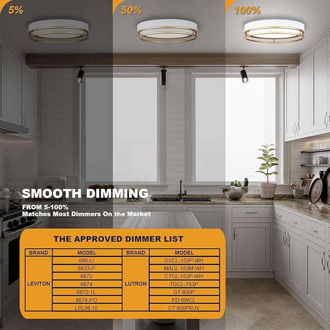- 5%-100% SMOOTH DIMMING: The close to ceiling light fixture is compatible with most LED dimmers in the market. You can choose 100% full brightness for working and 5% brightness for the night light. This light fixtures ceiling mount has no noise and no flickers when dimming