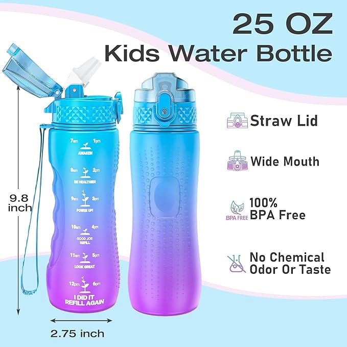 OLDLEY Kids Water Bottle for School, 25 oz (Straw Lid) BPA-Free Reusable Leak-proof Durable Tritan Plastic Water Bottles with One-handed Opening Straw Lids, Anti-dust Spout Cover (Lake)