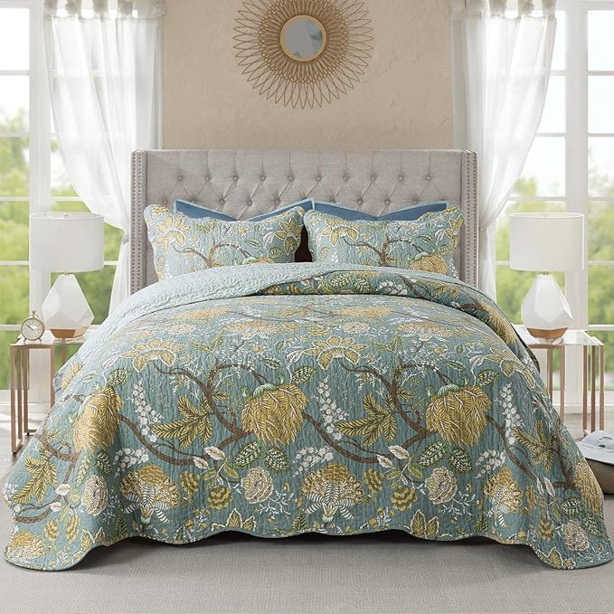 NEWLAKE Cotton Bedspread Quilt Sets-Reversible Patchwork Coverlet Set, Green Floral Pattern, King Size