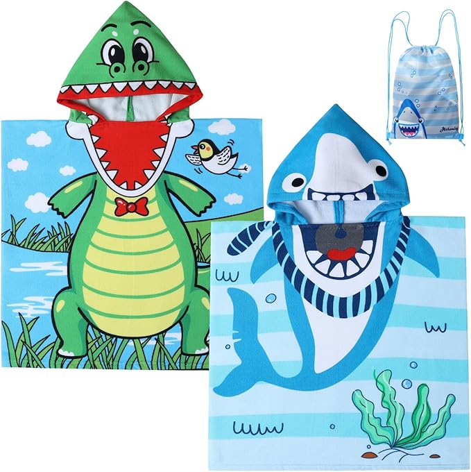 Lightweight Wearable Hooded Beach Towel Poncho for Kids, Toddlers Bath/Pool/Swim Poncho Cover-ups Swimwear Alligator & Shark 2PCS