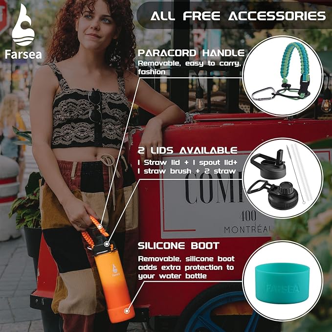 - WHAT YOU'LL GET: Farsea is committed to providing the best value and highest quality to the customers; We offer Continuous After-sales Service and Solve All Problems; We offer several different capacity bottles(12 oz, 18oz, 24 oz, 32 oz, 40oz) and you can choose according to your needs; Package: Comes with 2 lids (Straw lid & Spout Lid), paracord holder, protective Silicone Boot, nice packing box, 2 straws, and straw brush