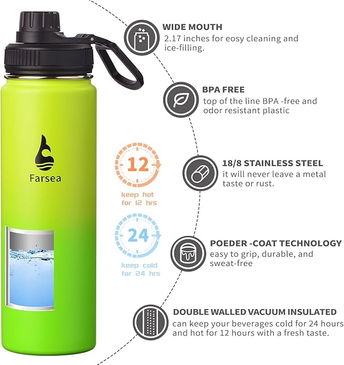 - WHAT YOU'LL GET: Farsea is committed to providing the best value and highest quality to the customers; We offer Continuous After-sales Service and Solve All Problems; We offer several different capacity bottles(12 oz, 18oz, 24 oz, 32 oz, 40oz) and you can choose according to your needs; Package: Comes with 2 lids (Straw lid & Spout Lid), paracord holder, protective Silicone Boot, nice packing box, 2 straws, and straw brush