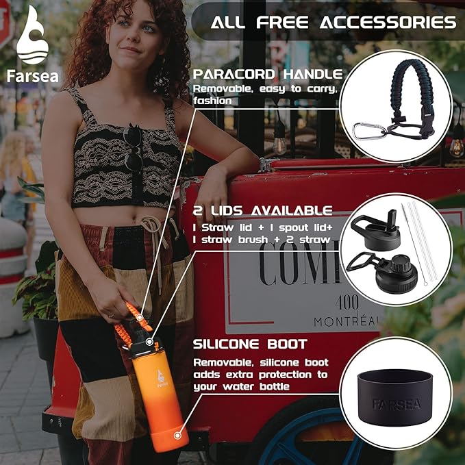 - WHAT YOU'LL GET: Farsea is committed to providing the best value and highest quality to the customers; We offer Continuous After-sales Service and Solve All Problems; We offer several different capacity bottles(12 oz, 18oz, 24 oz, 32 oz, 40oz) and you can choose according to your needs; Package: Comes with 2 lids (Straw lid & Spout Lid), paracord holder, protective Silicone Boot, nice packing box, 2 straws, and straw brush