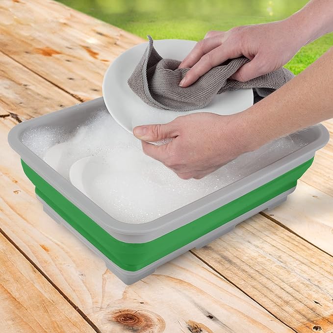 - WASH BASIN SET OF TWO – These versatile bins can be used for a variety of tasks at home and on the go. Each collapsible dish tub can be used as an ice bucket, camping sink, for gathering and rinsing fresh produce, as a cleaning caddy, car wash bucket and more.