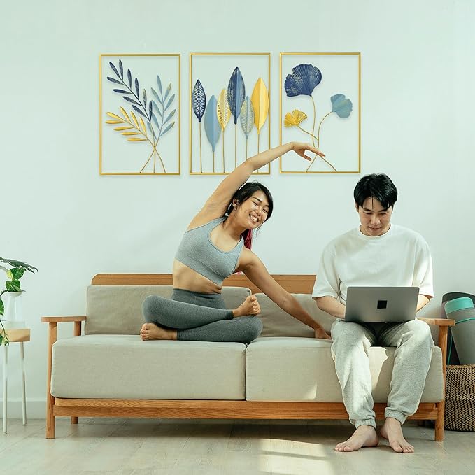 FUNTEREST Gold Leaf Wall Decor Modern Wall Art Home Decor, Set of 3 Metal Wall Hanging Decoration for Living Room Office Bedroom Hotel