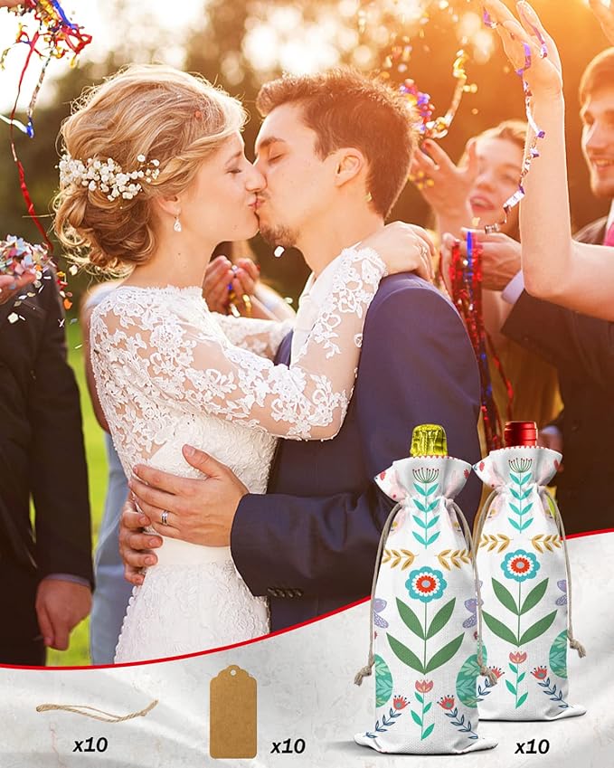 - đ·GREAT VALUE PACKAGE - Each package includes 10 burlap wine bags with built-in drawstrings, and both come with rectangular gift tags and jute cords, craft paper tags with blank designs, elegant love or wishes. This wine bags set combo will meet all your wine packaging needs. You can hang the tag on the wine storage bag with jute cord attached.