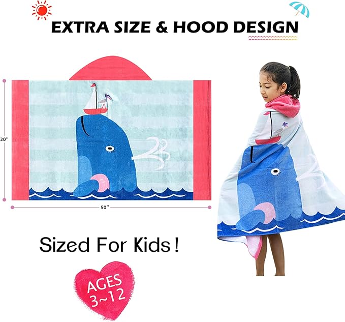 - Ideal Size: The size of the hooded pool towel is 50" x 30"(not including hood), can last through growth spurts, one size fits toddlers to big kids, large enough for ages 3 to 12 years. You know, your child grows very fast, a favorite bath hooded towel can accompany them for a long time. Wonderful beach towel, wonderful childhood!