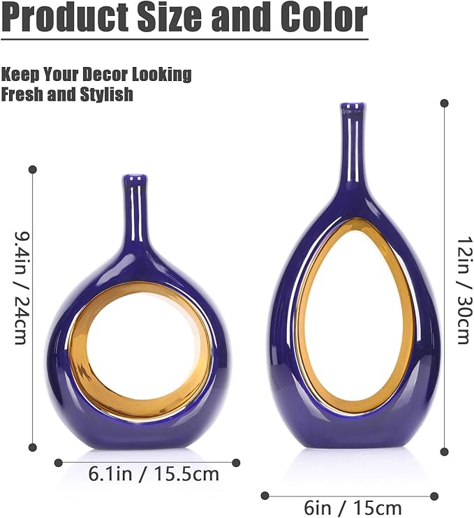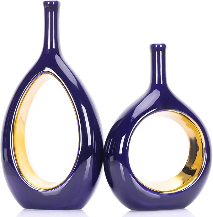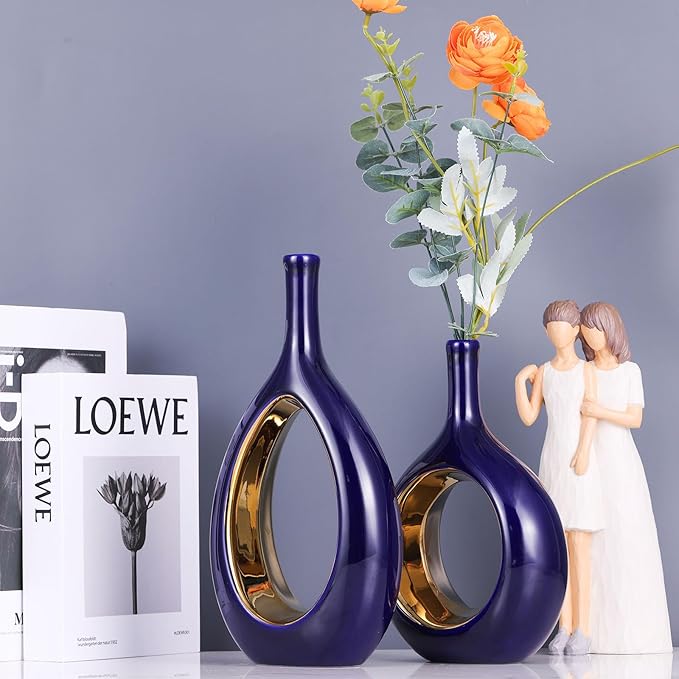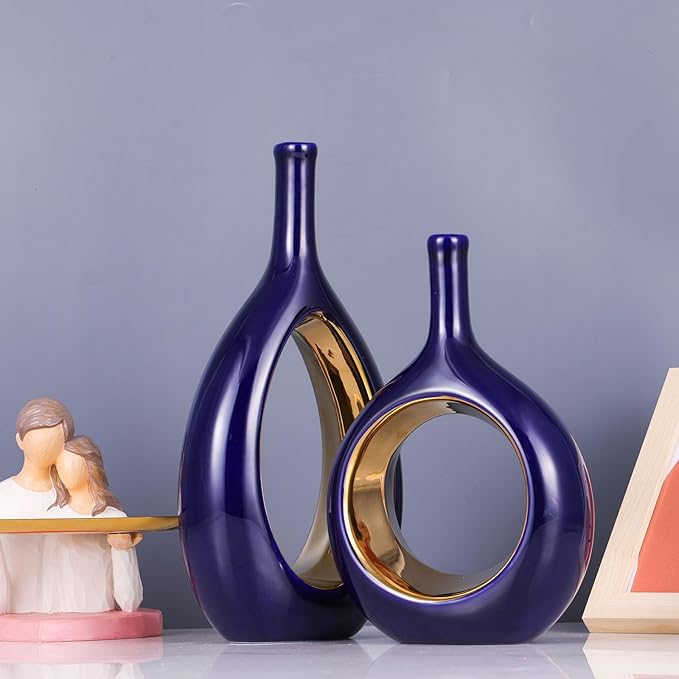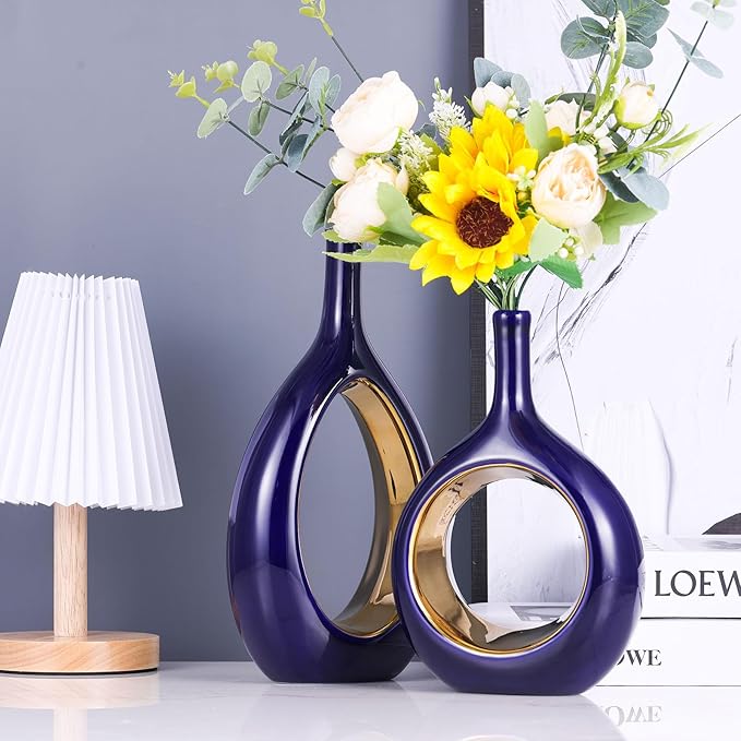 Blue Gold Ceramic Vase Set 2,Modern Hollow Circle with Hole Flower Vase for Home Decor,for Table Centerpieces,Farmhouse,Fire Place,Living Room,Bedroom,Office,Bookshelf,Rustic Decor