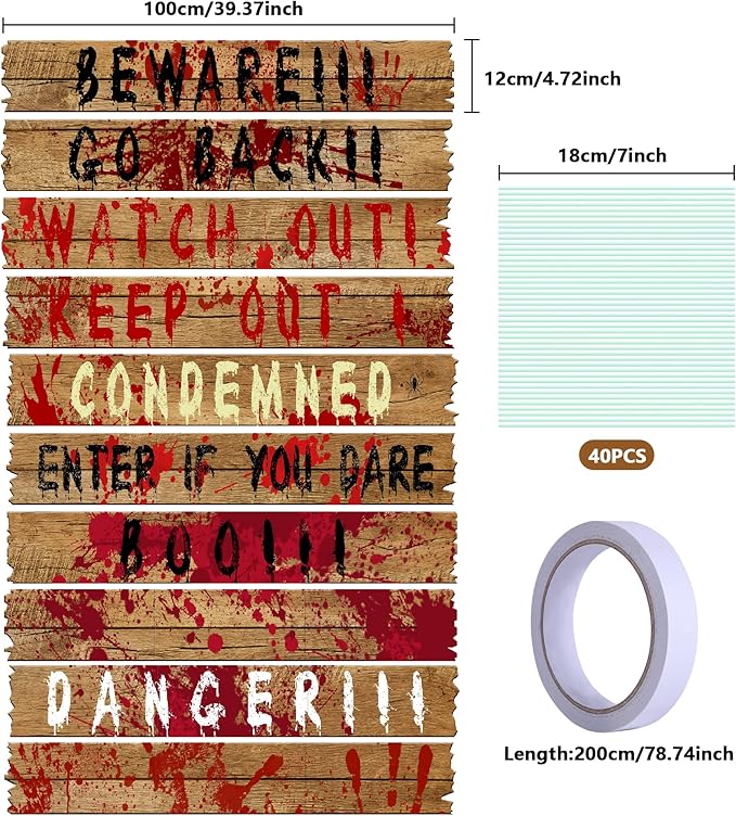 10pcs 39"x4.7" Halloween Haunted Window Boards, Beware Signs Window Warning Signs,Waterproof Outdoor Scary Sign for Halloween Party Decoration (10pcs window boards)