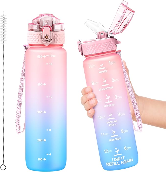 OLDLEY Kids Water Bottle for School, 17 oz (Straw Lid) BPA-Free Reusable Leak-proof Durable Tritan Plastic Water Bottles with One-handed Opening Straw Lids, Anti-dust Spout Cover (Pink-Blue)