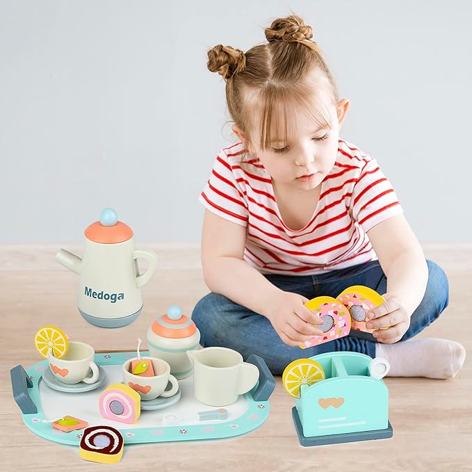 Wooden Tea Set toy Play Kitchen Accessories for Kids Pretend Play Food for Toddlers Tea Party Set for 3, 4, 5 Year Old Girls and Boys (Tea Set)
