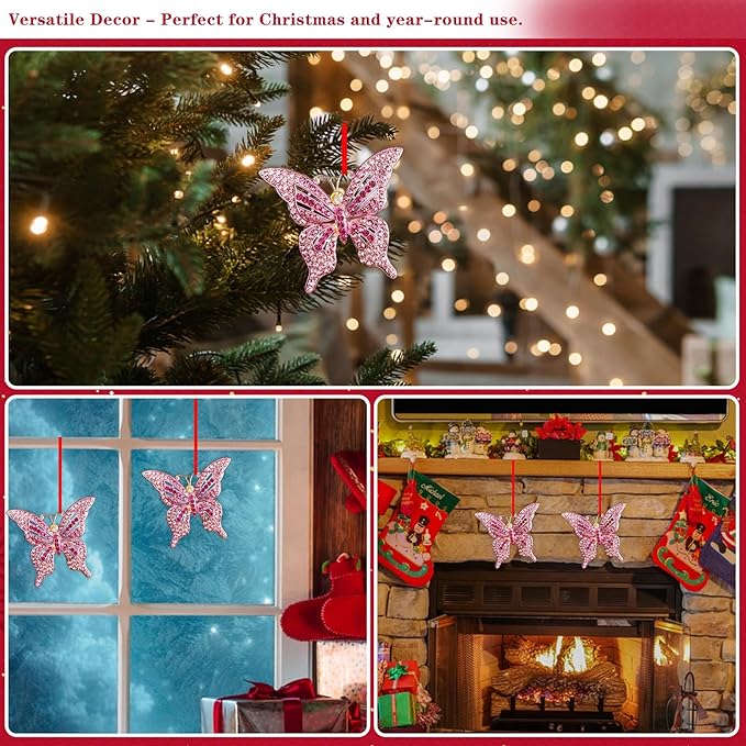 - 【Material】: Pink butterfly keepsake ornaments for Christmas trees are made of quality metal and rhinestone, which is bright color, lightweight and weather resistant, perfect butterfly ornament for Christmas tree decorations.