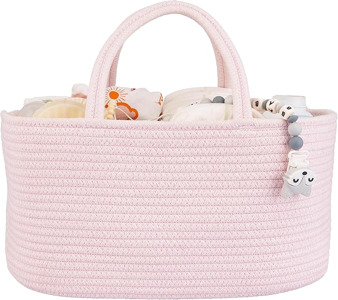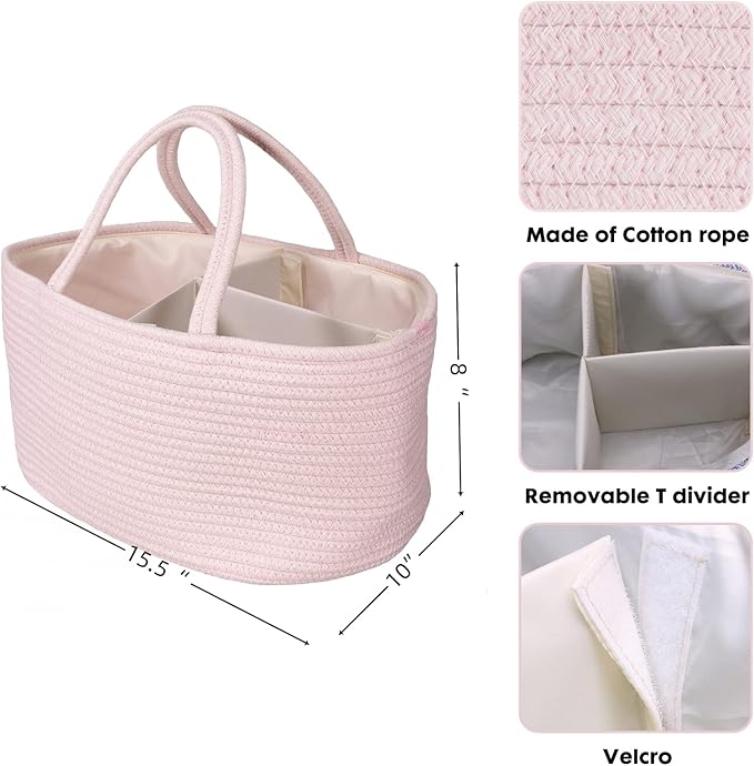 Large Baby Diaper Caddy Organizer for Girl Boy Rope Nursery Storage Bin Basket Portable Holder Tote Bag for Changing Table Car Travel Baby Shower Gifts Newborn Essentials Registry Must Haves Pink