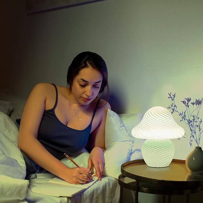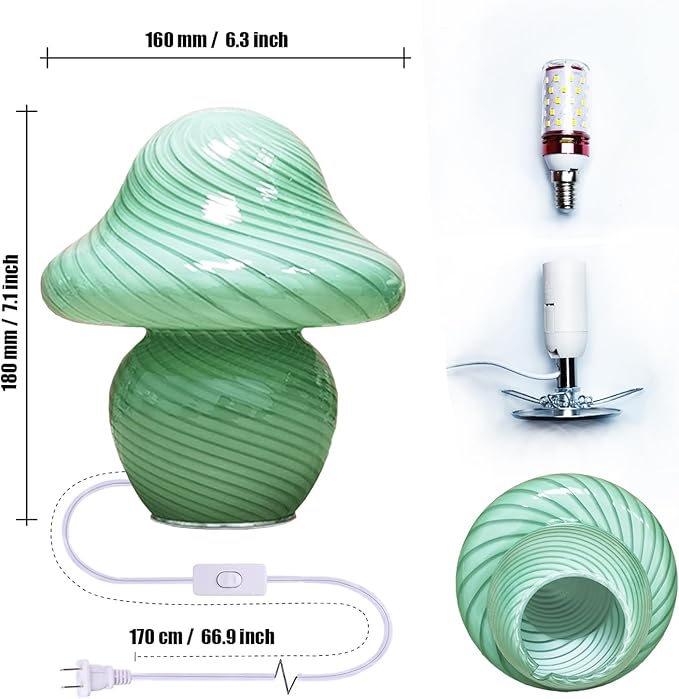 - 【Easy to clean, dust-proof design】:The glass mushroom table lamp is simple in structure, easy to operate and maintain. The one-piece closed glass design will not let dust enter the interior. The semi-circular top has a smooth appearance, not easy to accumulate dust, and easy to wipe.