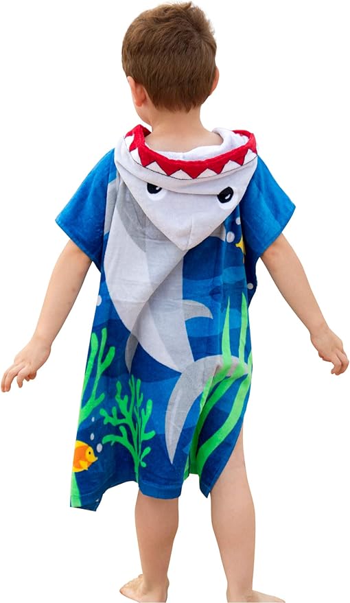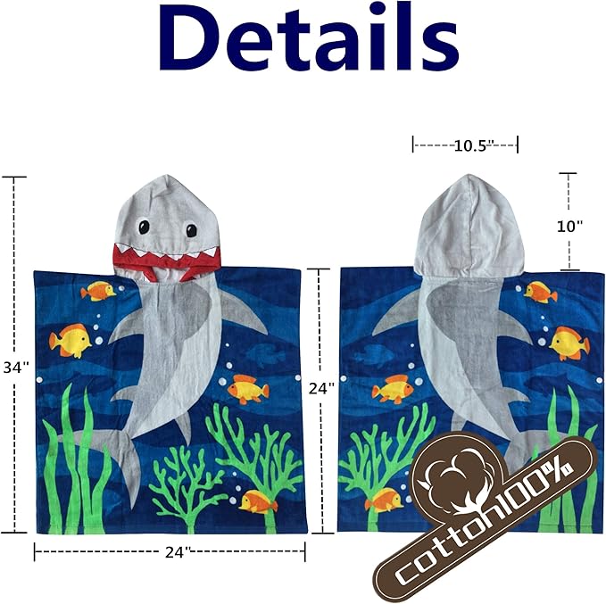 - 🦈 GREAT SIZE FOR 1-5 YEARS: 24"x48" in full-length and 24"X24" in folded-size with a 10"(W)x10(H)" hood. The poncho towels are suitable for 1 to 5 years old growing toddlers and kids.