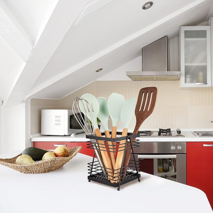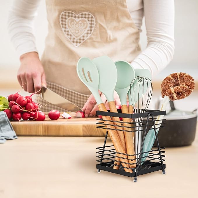 - Drain Hold Design for Fast Drying: The open frame of this utensil crock caddy, and it is easy to clean and dry; Along with sinking bottom allows water to smoothly pass through for fast drying.