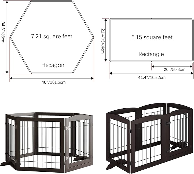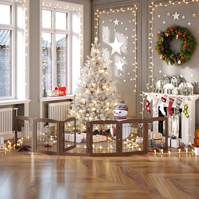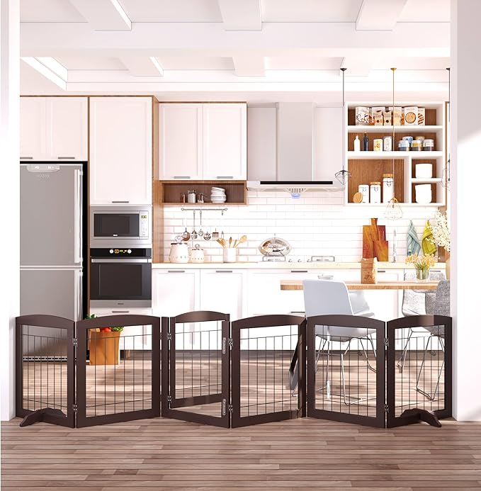 Folding Pet Gate 120" Wide, 24" Tall No-Assembly Wooden Dog Gate with Door Walk Through, Freestanding Wire Pet Gate, Pet Puppy Safety Fence, with 2PCS Support - Espresso