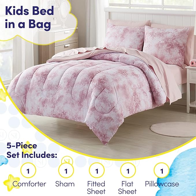 - COMPLETE BEDDING SOLUTION: Elevate your child's sleep space effortlessly with our Kid's Bed in a Bag Set. This all-inclusive package includes a comforter, fitted sheet, flat sheet, pillowcase, and sham – ensuring a coordinated and stylish look for their room.