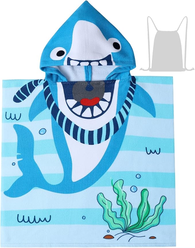 Kids Beach Towels with Hood Toddlers Hooded Towel Poncho Swim Cover-ups with Drawstring Bag (Blue Shark (24x24 inches))