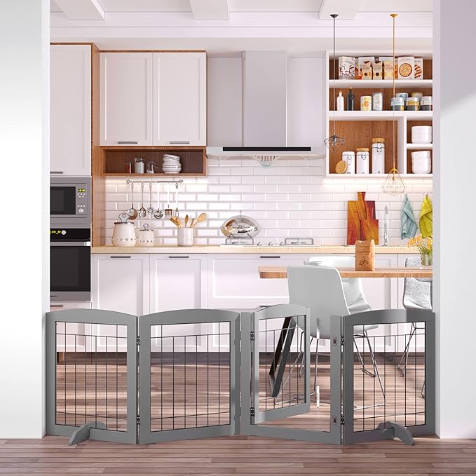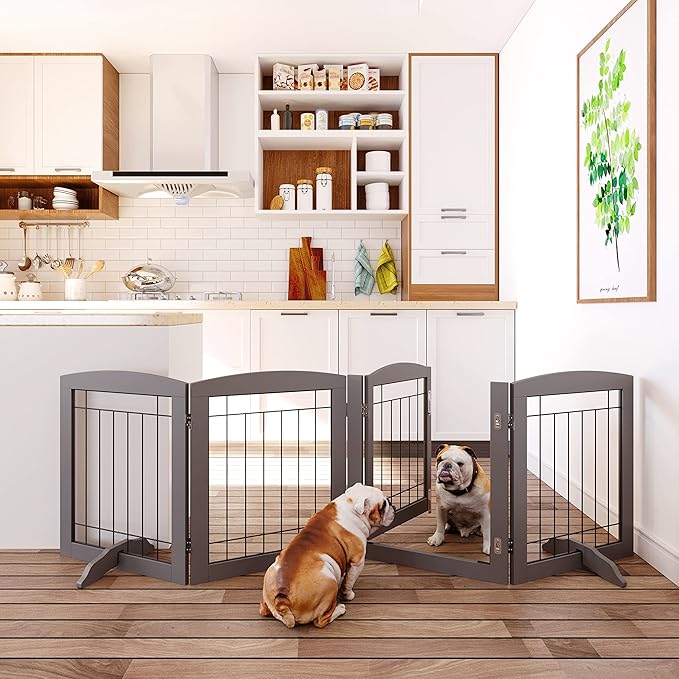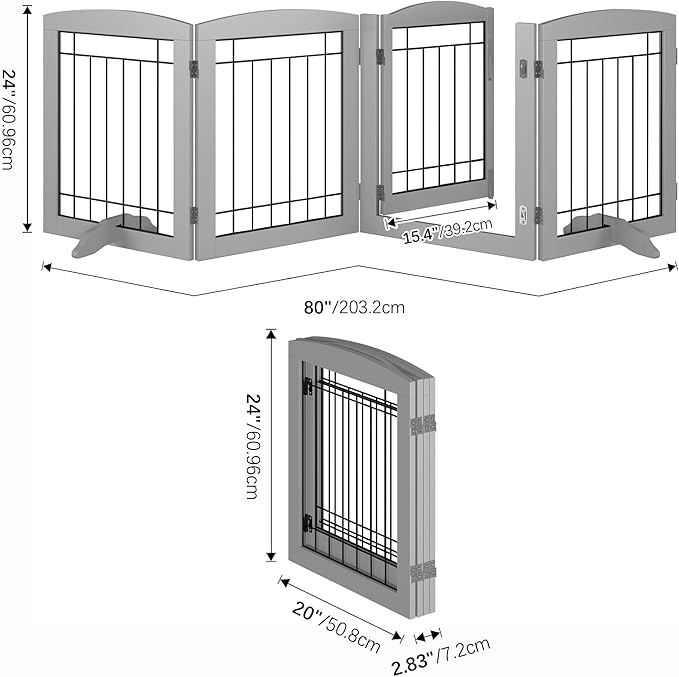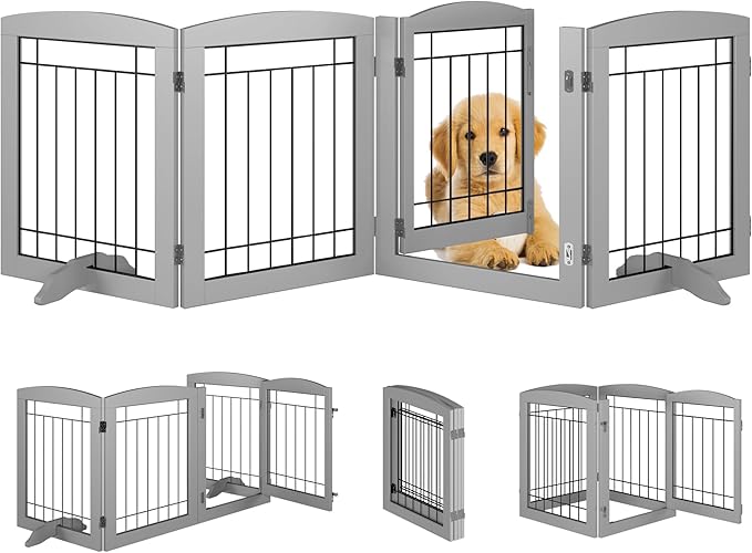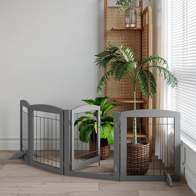 Folding Pet Gate 80" Wide, 24" Tall No-Assembly Wooden Dog Gate with Door Walk Through, Freestanding Wire Pet Gate, Pet Puppy Safety Fence, with 2PCS Support - Gray