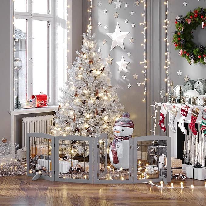 - Folds for storage——The pet gate features an Accordion style design that folds for compact storage when not in use. When folded, this expandable fencing is small enough to conveniently fit in the closet.