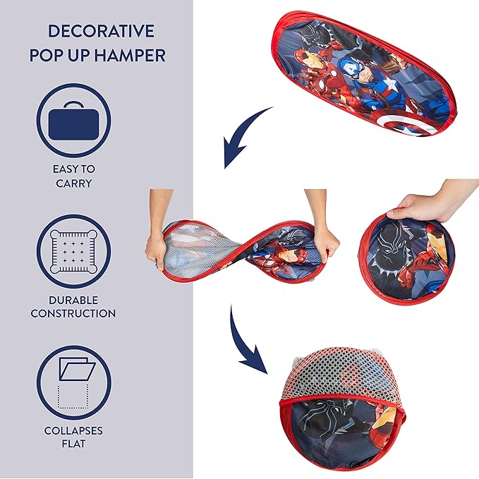 - DESIGN: Pop up hamper featuring Avengers printed with iconic graphics featuring Black Panther, Iron Man and Captain Americafrom the famous brand. This pop up hamper features your child's favorite characters and will make an adorable addition to a bedroom or bathroom décor.
