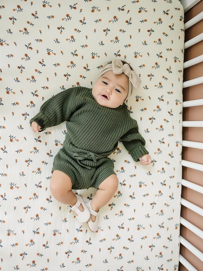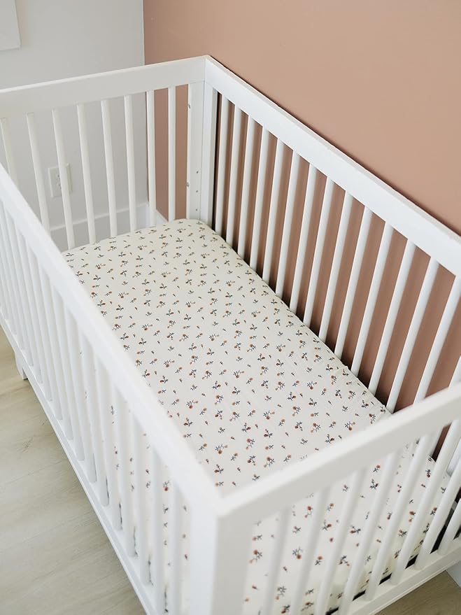 Cream Floral Muslin Crib Sheet by Mebie Baby, Soft and Breathable Bed Sheets for Babies, Modern Neutral Bedding for Cribs, Standard Crib Mattress Fitted Sheet, Great for Boy or Girl Room or Nursery
