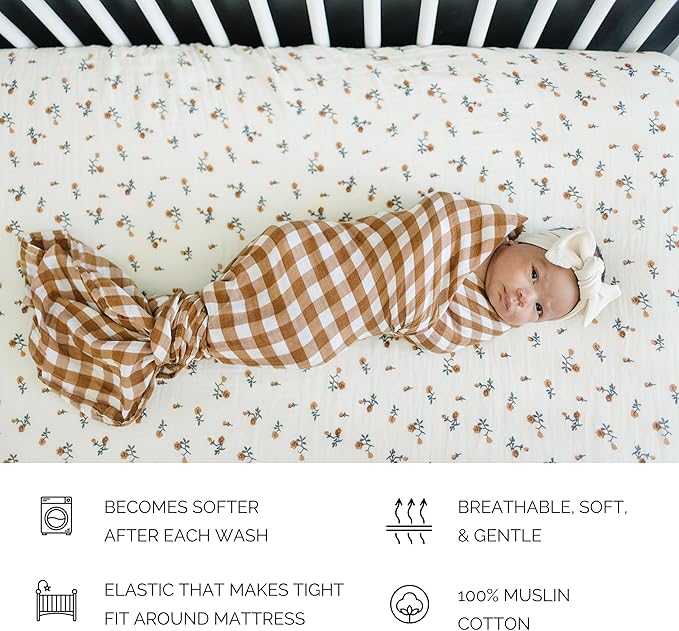 - Soft Muslin Sheets – Made with 100% Muslin Cotton, these sheets are soft to the touch and breathable, made to keep baby sleeping comfortably.