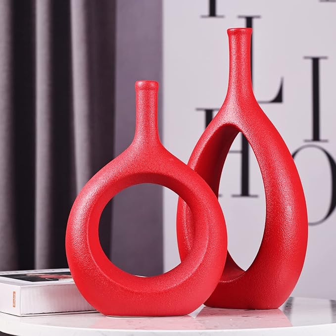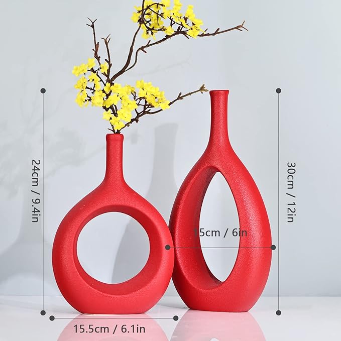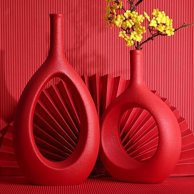 Red Ceramic Vase Set 2,Modern Hollow Circle with Hole Flower Vase for Home Decor,for Table Centerpieces,Farmhouse,Fire Place,Living Room,Bedroom,Office,Bookshelf,Rustic Decor
