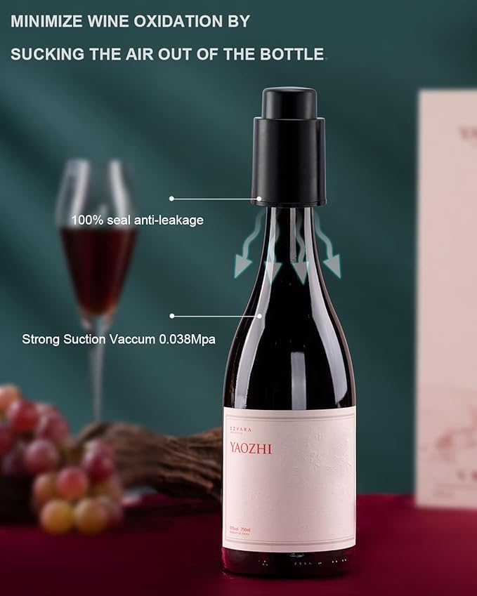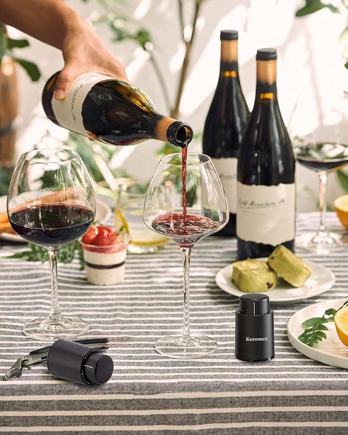 - 【Preserve Your Wine's Freshness for Extended Periods】Prevent rapid wine oxidation by extracting air from the bottle. Simply activate the vacuum wine stopper multiple times until it secures itself snugly. This method aids in maintaining the wine's taste and freshness for up to 7 days, outperforming traditional cork in preserving freshness. Promises a 100% sealed, leak-proof experience.